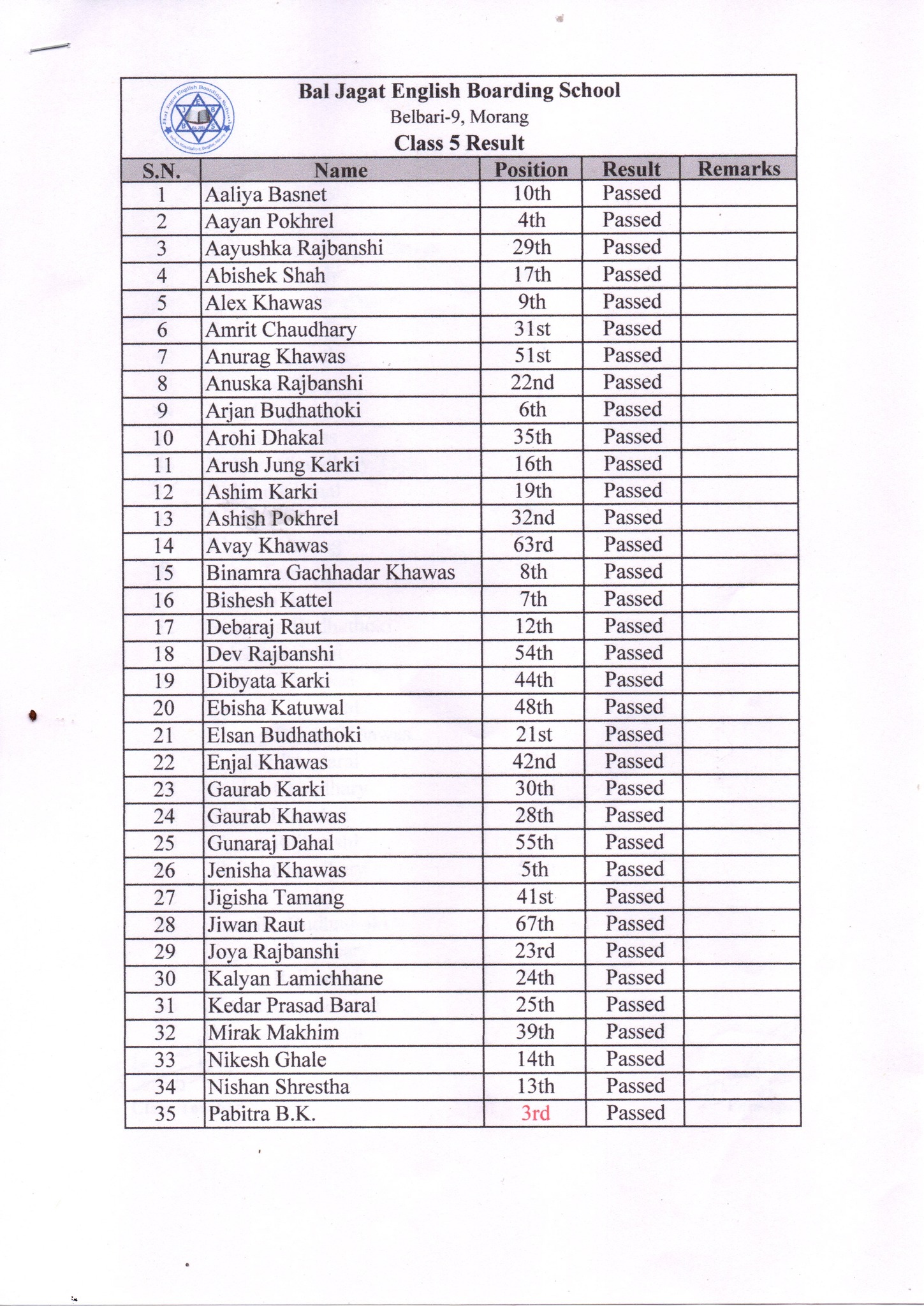 यस विद्यालयमा अध्ययनरत कक्षा ५ का विद्यार्थीहरूले २०८१ सालमा बेलबारी नगरपालिकाद्वारा सञ्चालन गरिएको परीक्षामा सहभागिता जनाएका थिए। सो परीक्षाको नतिजा निम्नानुसार रहेको जानकारी गराइन्छ। कृपया विद्यार्थी, अभिभावक तथा सरोकारवालाहरूले विद्यालयमा सम्पर्क गरी विस्तृत जानकारी लिनुहुन अनुरोध छ।