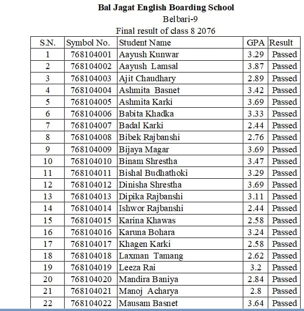 The final result of Class 8 for the academic year 2076 has been published. All students, parents, and guardians are kindly requested to check the result on the school notice board or contact the school administration for further details. Congratulations to all the students for their efforts and achievements!